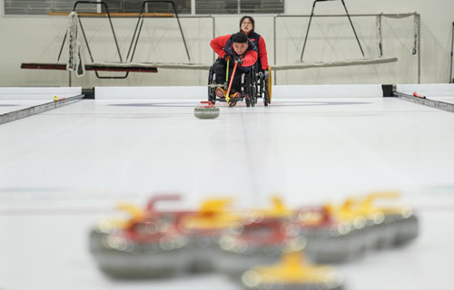 輪椅冰壺運動員王海濤(前)在國家殘疾人冰上運動比賽訓練館投壺。新華社記者彭子洋攝。