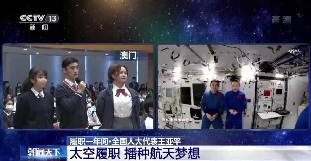 2021年12月9日,中國空間站首次太空授課活動(dòng)“天宮課堂”開講。課堂上,除了和北京、廣西南寧、四川汶川的青少年展開互動(dòng),王亞平還與來自香港、澳門青年學(xué)生分享了太空的奇妙。