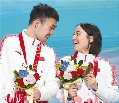3月6日,北京冬殘奧會(huì)高山滑雪女子超級(jí)大回轉(zhuǎn)視障組比賽頒獎(jiǎng)儀式在北京延慶冬殘奧頒獎(jiǎng)廣場(chǎng)舉行。圖為獲得季軍的中國(guó)代表團(tuán)運(yùn)動(dòng)員朱大慶(右)和引導(dǎo)員閆寒寒在頒獎(jiǎng)儀式上。新華社記者 雒 圓攝