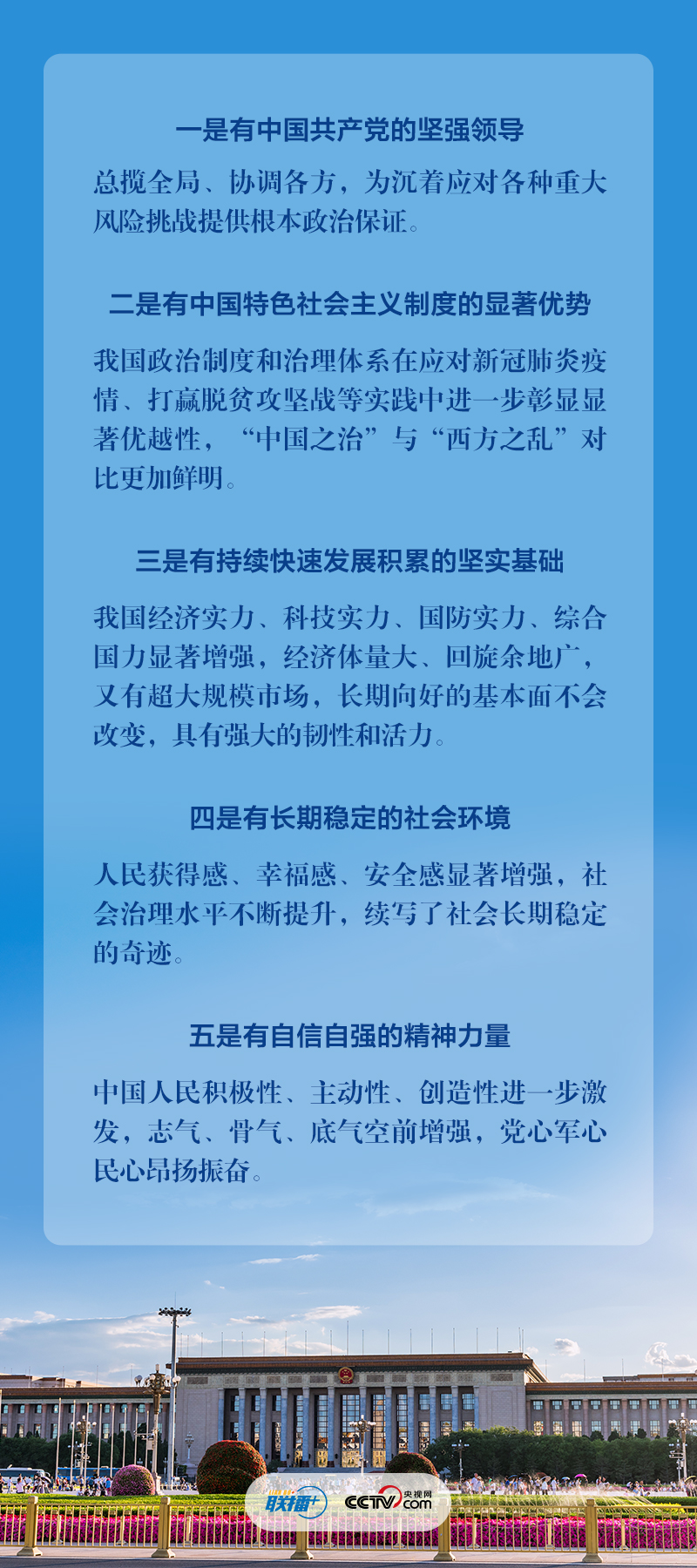當前,國際形勢繼續發生深刻復雜變化,百年變局和世紀疫情相互交織,經濟全球化遭遇逆流,大國博弈日趨激烈,世界進入新的動蕩變革期,國內改革發展穩定任務艱巨繁重。總書記在講話中列舉了我國發展中具備的五方面戰略性有利條件: