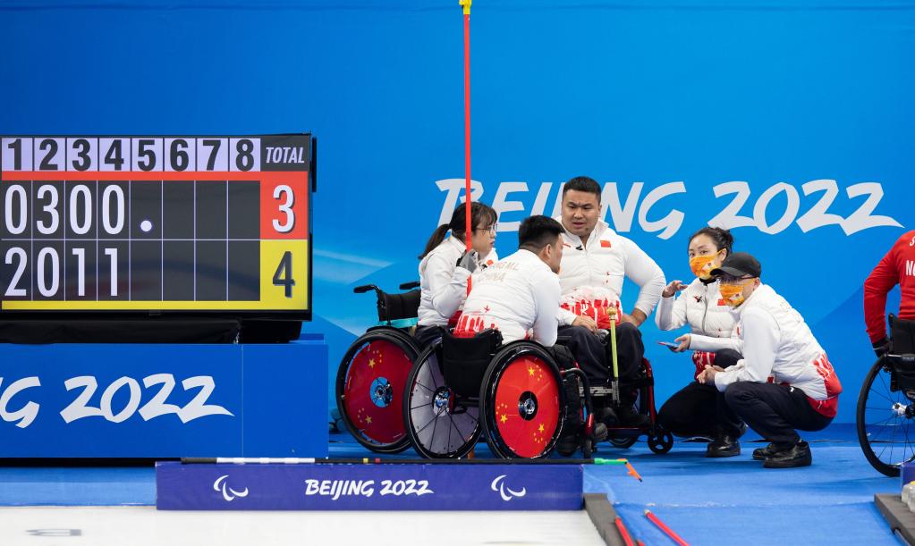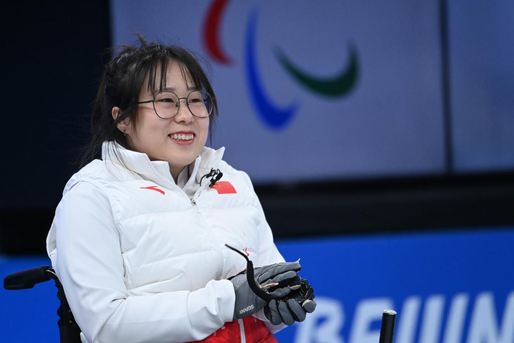 3月6日,中國隊選手閆卓在北京2022年冬殘奧會輪椅冰壺循環賽比賽中。新華社記者任超攝