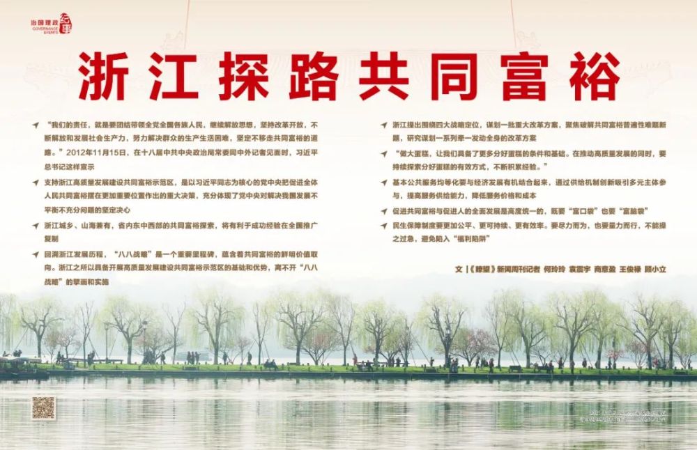 正努力成為全面展示中國特色社會主義制度優越性重要窗口的浙江,站在新起點上,承擔著通過實踐進一步豐富共同富裕的思想內涵、率先破解發展不平衡不充分問題等重大使命。朝著建設高質量發展高品質生活先行區、城鄉區域協調發展引領區、收入分配制度改革試驗區、文明和諧美麗家園展示區的目標,浙江將乘勢而上、久久為功,為全國實現共同富裕先行探路。