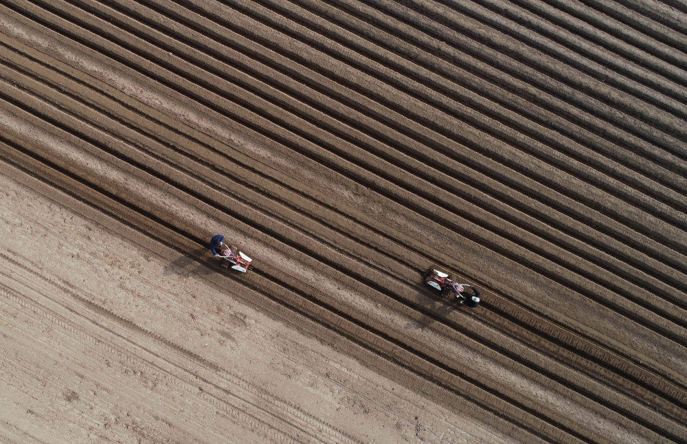 ↑ 河北省趙縣韓村鎮天舟農作物種植專業合作社的社員操作機械設備在田間耕作。