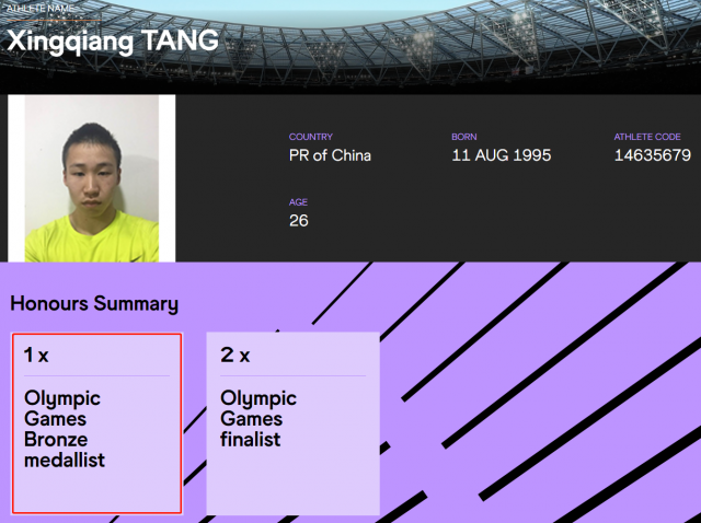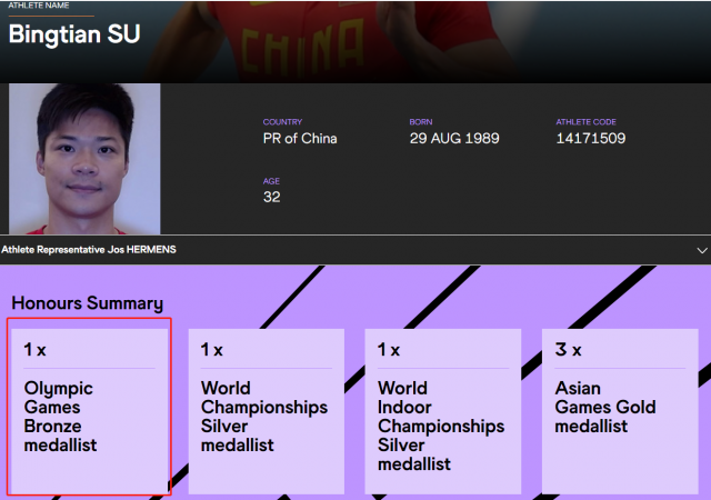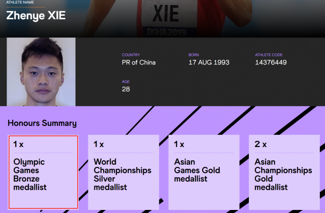 據國際田聯官網信息,國際田聯的運動員介紹中,蘇炳添、謝震業、吳智強、湯星強的資料上都標注了奧運會銅牌。恭喜中國接力隊!