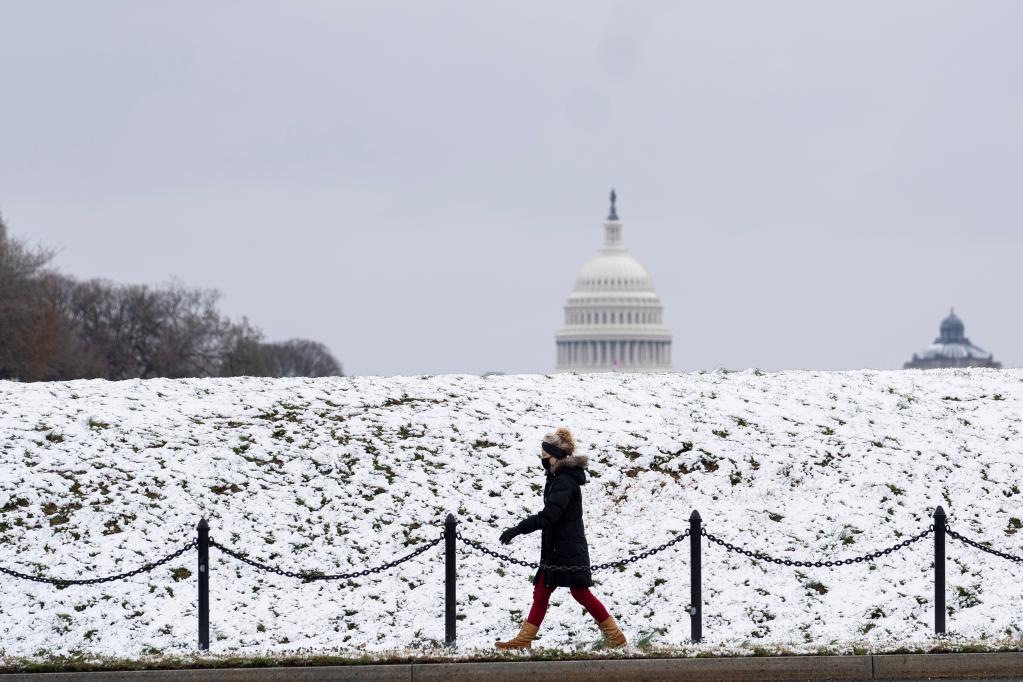 3月12日,在美國首都華盛頓,一名女子從國會大廈附近走過。(新華社記者劉杰攝)