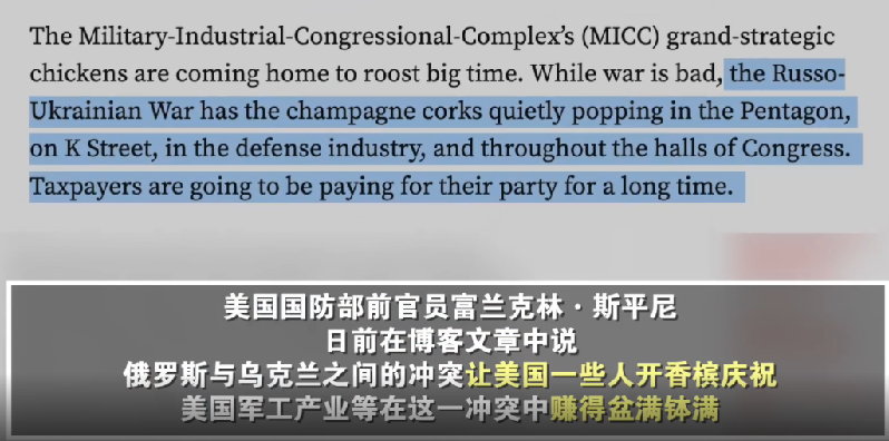 “俄烏沖突爆發以來,五角大樓(美國國防部)、K街(華盛頓游說公司聚集地)、軍工企業以及整個國會大廈內,都在悄悄地開香檳慶祝!曾在美國國防部長辦公室工作26年的富蘭克林·斯平尼如此點評。