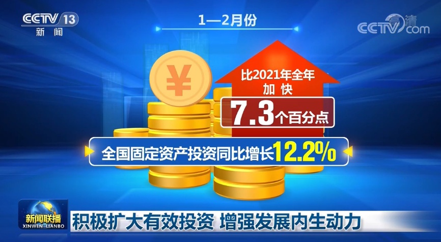 最新統(tǒng)計數據顯示,1—2月份,全國固定資產投資同比增長12.2%,比2021年全年加快7.3個百分點,其中,投資新開工項目個數同比增長1.1倍,新開工項目計劃總投資增長62.8%。