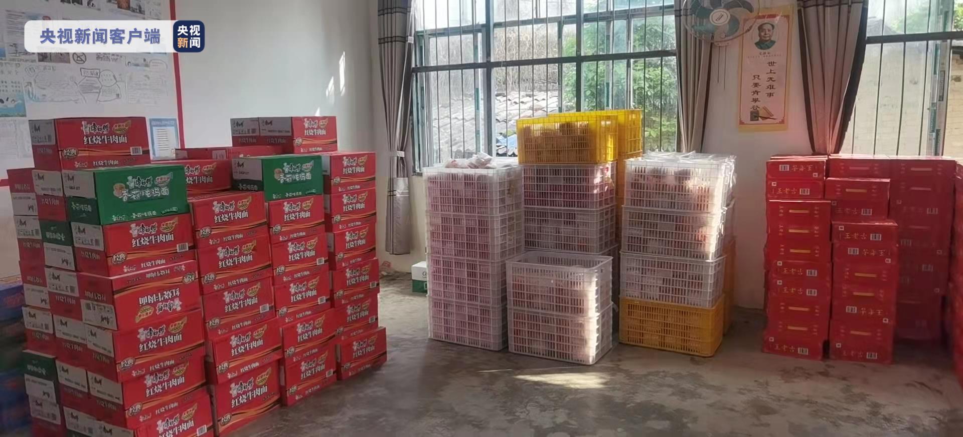 救援物資運達救援現(xiàn)場,含面包200斤、雨鞋200雙、手電280只、鐵鏟100把、八寶粥90箱、礦泉水120箱、帳篷133頂、沖鋒衣200件、折疊桌椅50套、雨衣550套、照明燈4臺、充電寶550個、防護口罩2萬只、通用手套500雙、移動照明10套、消毒粉50千克、消毒液100瓶、消毒酒精200瓶、牛奶70箱。
