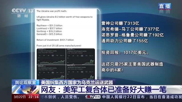“軍工復(fù)合體已經(jīng)準(zhǔn)備好大賺一筆了。”有網(wǎng)友貼出美國四家軍工巨頭的股價走勢圖,替他們算了一筆賬:“雷神公司賺了313億,洛克希德-馬丁公司賺了377億,諾思羅普-格魯曼公司賺了192億,通用動力公司賺了155億。投資回報(bào):1017億美元。這還只是25家主要美國武器制造商中的4家!”
