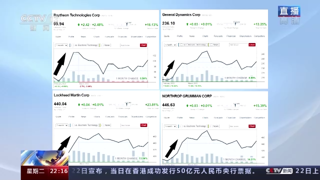 的確如網(wǎng)友所說,美國多家軍工巨頭的股價都在2月下旬俄羅斯發(fā)動特別軍事行動前后出現(xiàn)大幅上漲,雖然后來有所回落,但跟一個月前相比仍然基本處于漲勢,其中諾思羅普-格魯曼公司的股價上漲了14.31%,洛克希德-馬丁公司的股價上漲了13.94%,通用動力公司的股價上漲了8.89%,雷神公司的股價上漲了6.84%。