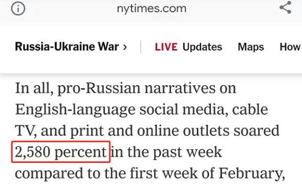 △《紐約時報》文章說,2月末,英文社交媒體上,挺俄言論相比2月初漲了25.8倍。