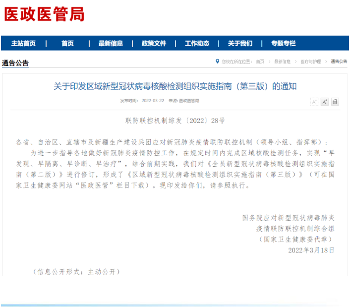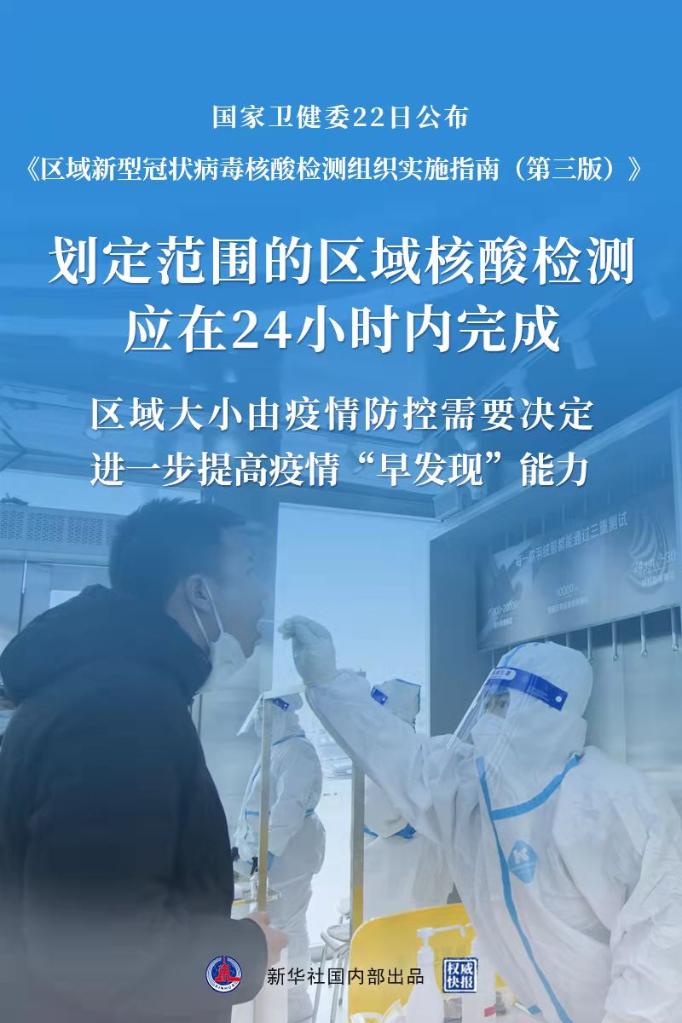 國家衛生健康委3月22日公布《區域新型冠狀病毒核酸檢測組織實施指南(第三版)》,將第二版指南中的“全員”修改為“區域”,區域大小由疫情防控需要決定;強調核酸檢測應該目標明確、有的放矢,不能搞“一刀切”;明確推進“抗原篩查、核酸診斷”的監測模式……新版指南看點幾何?