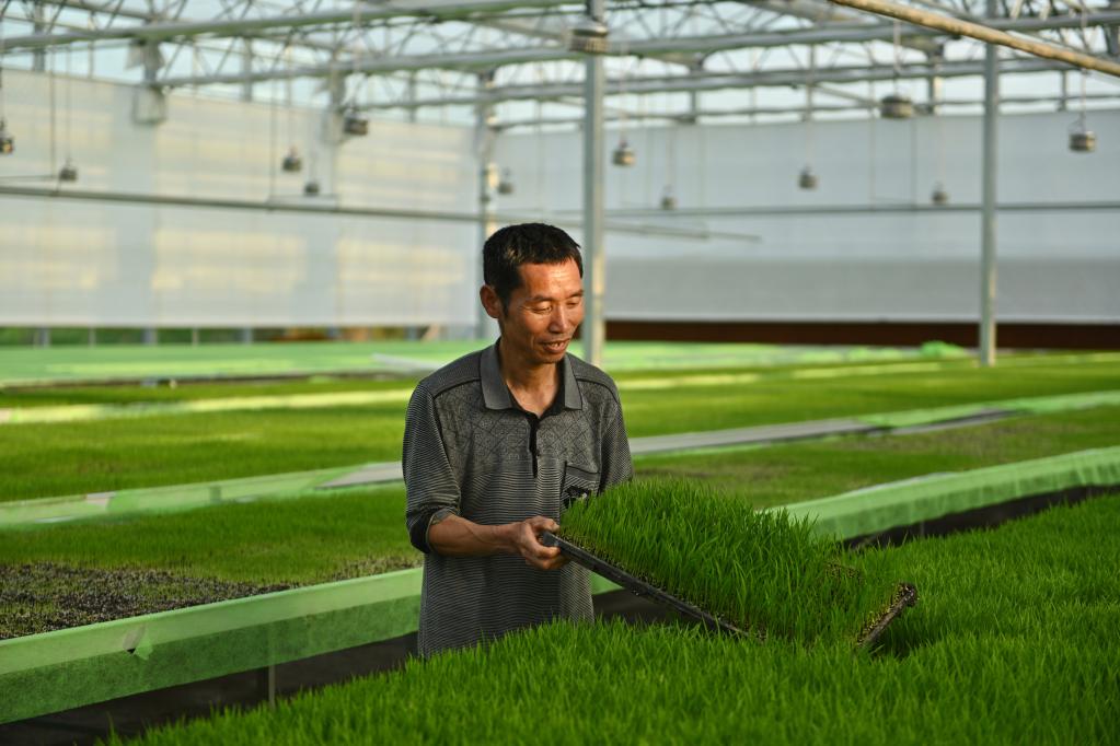 2022年3月17日,在四川省自貢市富順縣代寺鎮李子村,村民李朝富在大棚里查看水稻秧苗長勢。(新華社記者劉瓊 攝)