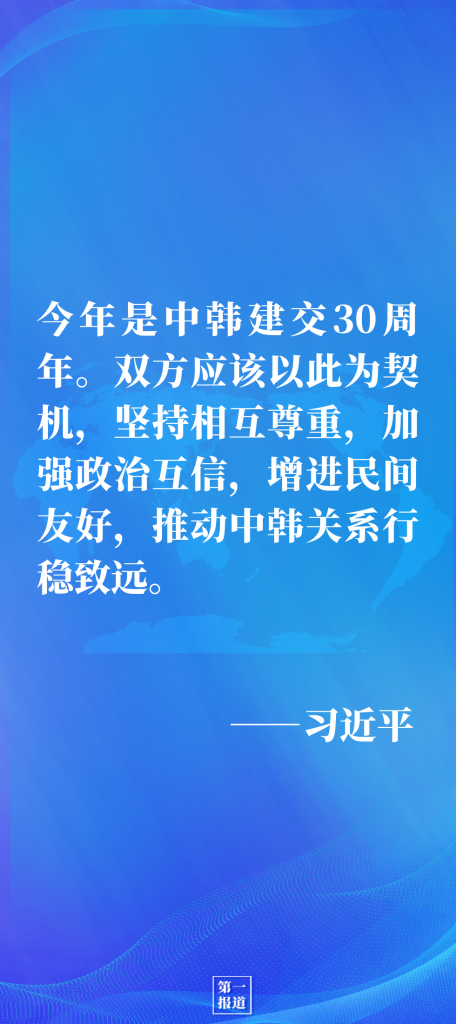 習近平指出,中韓是搬不走的永久近鄰,也是分不開的合作伙伴。中方一貫重視中韓關系。在雙方共同努力下,中韓關系全面快速發(fā)展,兩國業(yè)已成為戰(zhàn)略合作伙伴。事實證明,中韓關系發(fā)展符合兩國和兩國人民根本利益,促進了地區(qū)和平與發(fā)展。今年是中韓建交30周年。雙方應該以此為契機,堅持相互尊重,加強政治互信,增進民間友好,推動中韓關系行穩(wěn)致遠。