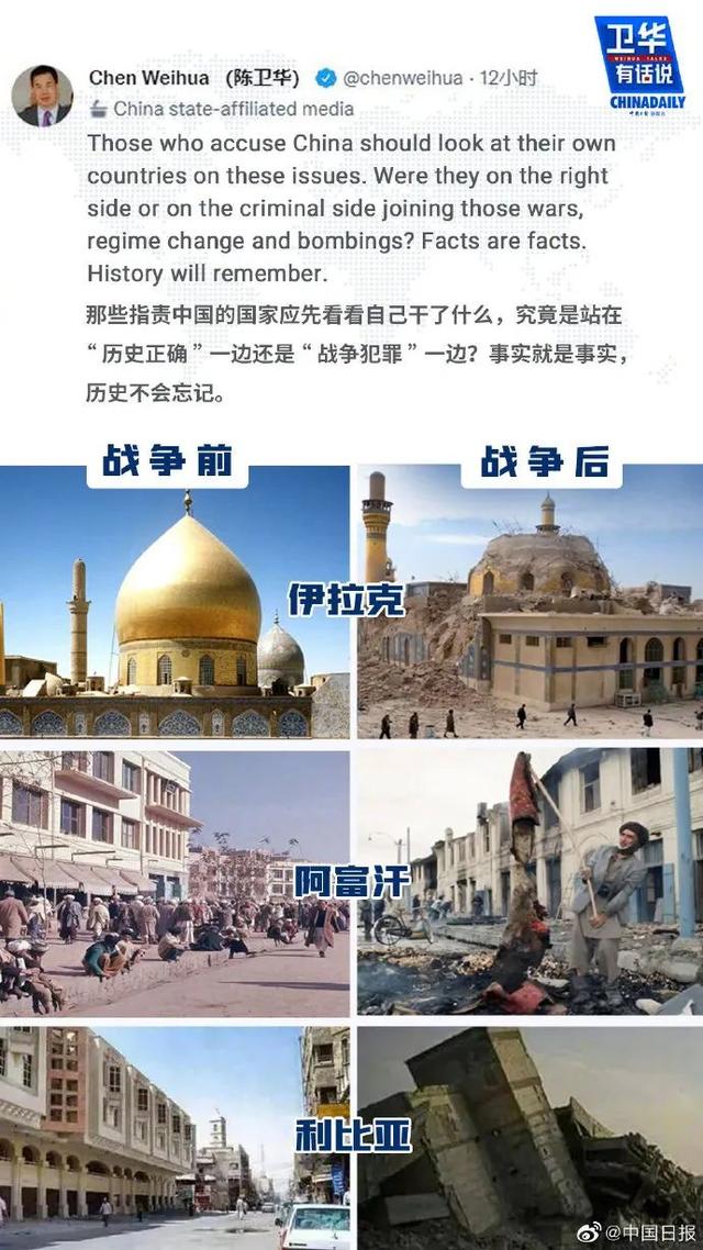 陳衛華在推文中指出了所謂“歷史正確一邊”的雙標。他說,那些指責中國站在歷史錯誤一邊的人不知道他們自己在說什么。當中國反對并譴責伊拉克和阿富汗戰爭、利比亞政權更迭、無人機襲擊主權國家、對古巴的禁運時,中國可真是站在了他們所謂的“錯誤”一邊。那些指責中國的人應該在這些問題上審視自己的國家,他們是站在正確的一邊,還是站在犯罪的一邊,參與那些戰爭、政權更迭和轟炸?事實就是事實。歷史會記住的。