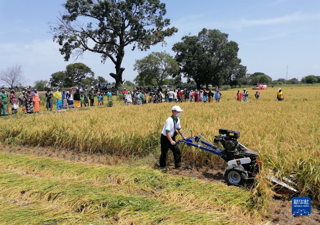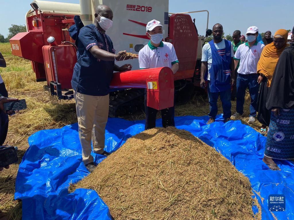 這是2021年10月8日,中國專家組成員在布基納法索中西大區水稻示范區指導機械化水稻收割作業。新華社發(中國農業組供圖)