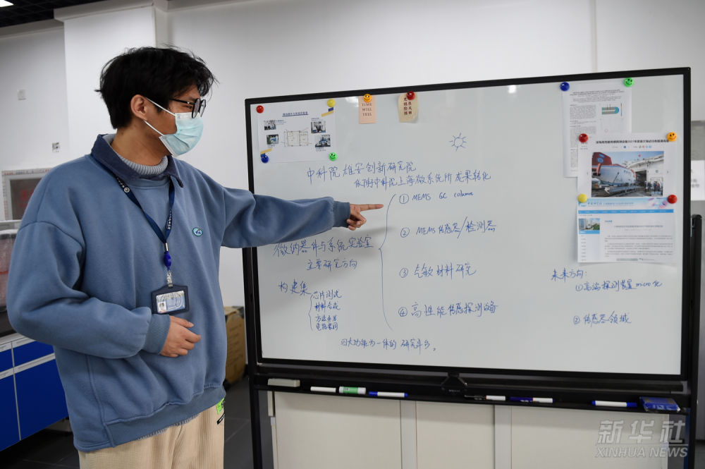 中科院雄安創新研究院工作人員介紹微納器件與系統實驗室主要研究方向(2022年3月8日攝)。2019年12月,中國科學院與河北省政府簽署協議,合作共建“雄安創新研究院”,重點突破產業基礎性關鍵技術、新興產業核心技術和開辟新領域的變革性技術,推動研究成果轉移轉化。