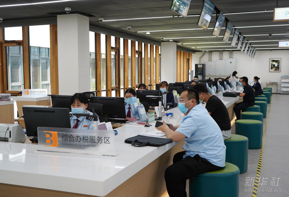 工作人員在河北雄安新區政務服務中心綜合辦稅服務區為居民辦理業務(2021年5月12日攝)。雄安新區政務服務中心成立于2018年5月30日,為企業和個人提供“一站式”行政審批事項受理和便民業務受理。