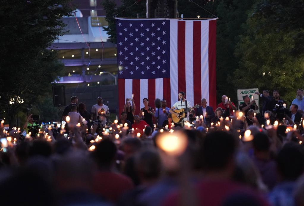 2019年8月4日,在美國俄亥俄州代頓市,人們為槍擊事件遇難者舉行悼念活動。美國俄亥俄州代頓市8月4日凌晨發生一起槍擊事件,造成包括槍手在內的至少10人死亡。新華社記者 劉杰 攝