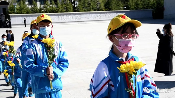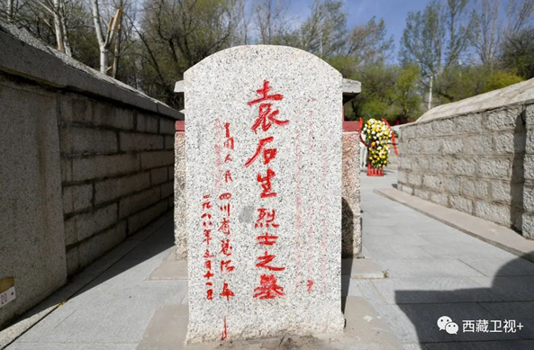 陵園正門上方用漢文和藏文書寫有“拉薩烈士陵園”,兩側刻有毛澤東的詩詞“為有犧牲多壯志,敢教日月換新天”。
