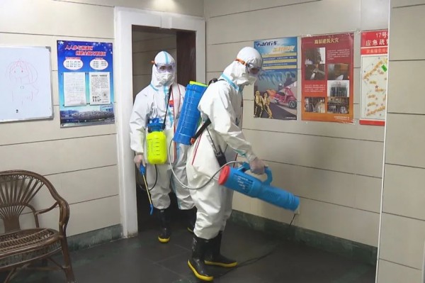 4月8日上午九點(diǎn),一輛消防車停在同濟(jì)綠園門口。曹雷、夏奧華兩人下了車,但他們穿的可不是火場(chǎng)里的隔熱服,而是穿上了“大白”防護(hù)服,背著沉重的消毒液。