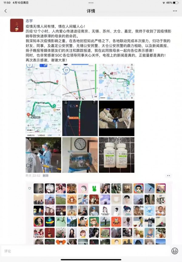 4月9日7時10分,陳先生發(fā)了一條朋友圈求助:“各位親朋好友,我現(xiàn)在急需南京的朋友人肉接力幫我媽緊急送個藥”“此藥巨貴且難買,如果大家誰有辦法完成接力,或部分路段的接力,請速與我聯(lián)系,非常感謝”。陳先生的求助引起大家的廣泛關注,朋友圈內(nèi)紛紛響應、并出謀劃策。