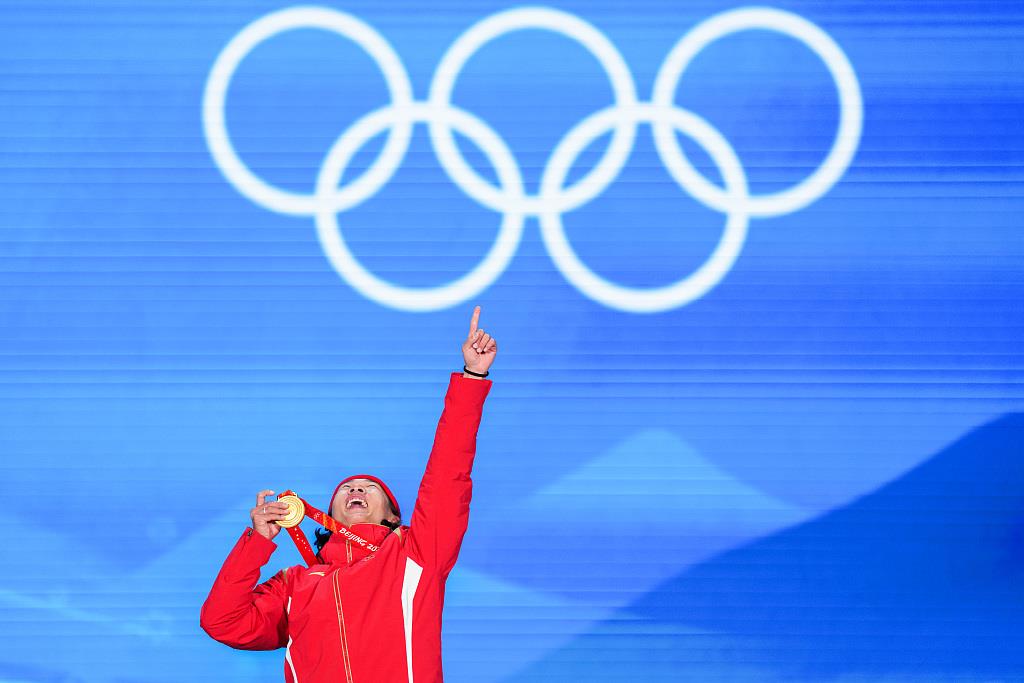 △2月15日,北京冬奧會單板滑雪男子大跳臺頒獎儀式,蘇翊鳴興奮站上領獎臺。