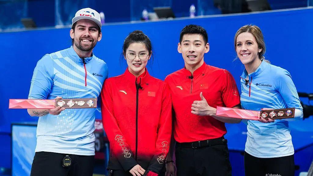 △北京冬奧會冰壺混合雙人循環賽后,中國隊與美國隊合影。