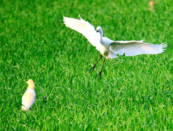 清晨,在縣城城郊壩子里的田間地頭,成群結隊的白鷺在稻田里覓食,時而站成一排在田埂上休息,時而互相追逐打鬧,人鳥和諧共處美如畫卷。