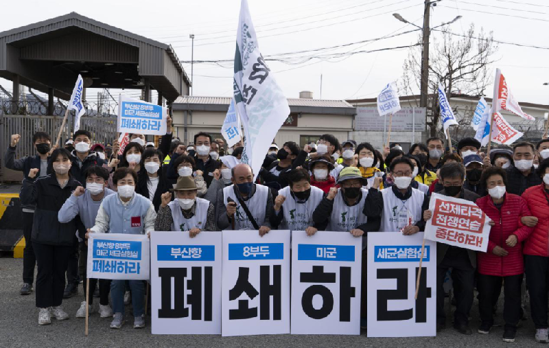 2022年4月5日,韓國民間團體和大學生在韓國釜山的美軍基地附近示威抗議,呼吁停止韓美聯合軍事演習,要求關閉釜山港美軍基地內的生物實驗設施。李相浩攝