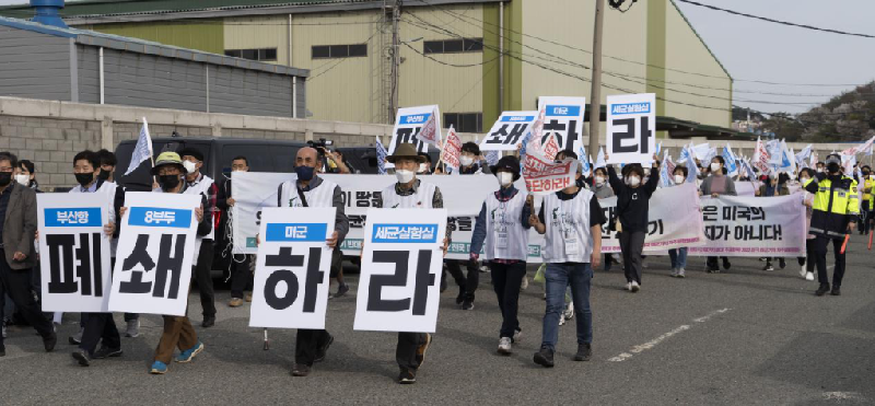 2022年4月5日,韓國民間團體在韓國釜山的美軍基地附近游行示威,呼吁停止韓美聯合軍事演習,要求關閉釜山港美軍基地內的生物實驗設施。李相浩攝
