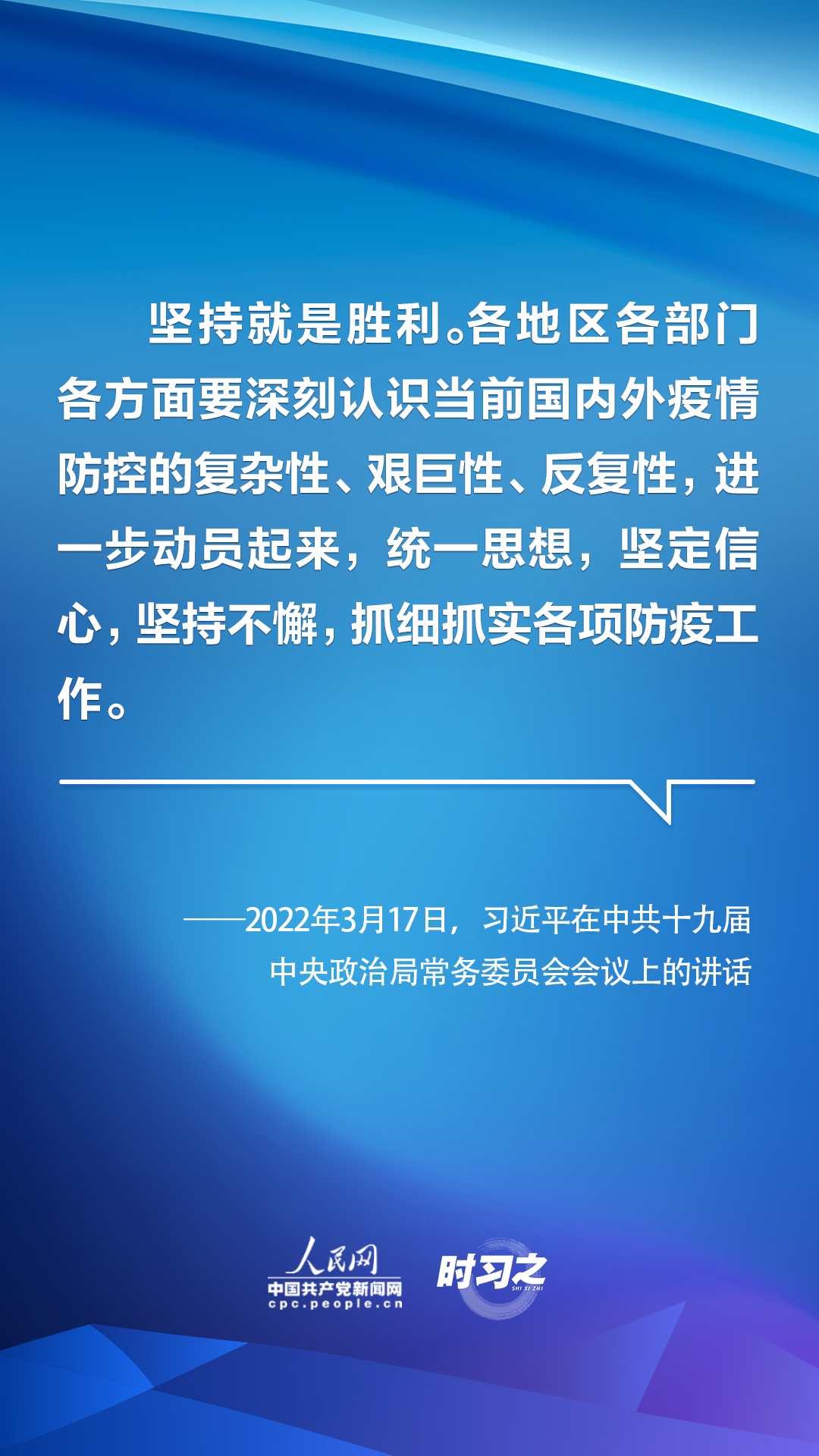 當前,我國防疫抗疫工作依然面臨嚴峻挑戰。面對復雜多變的疫情形勢,習近平總書記強調,堅持就是勝利。各地區各部門各方面要深刻認識當前國內外疫情防控的復雜性、艱巨性、反復性,進一步動員起來,統一思想,堅定信心,堅持不懈,抓細抓實各項防疫工作。