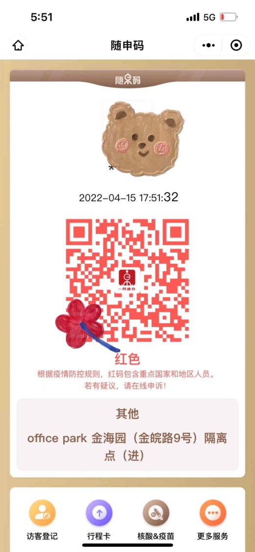 4月15日上午,核酸結果一出,三個紅碼,“它”來了!千防萬防,“它”還是來了。娃卻格外期待及雀躍,不停問我:“真的可以去方艙了嗎?能見外婆了嗎?我迫不及待了呢!”