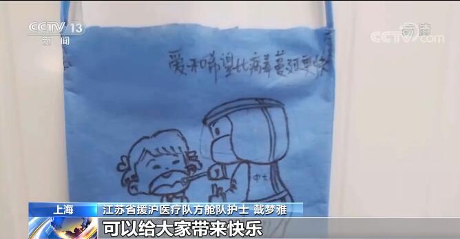 除了有心愿墻,方艙里的“大白”們還和患者們一起開展“套圈游戲”等趣味活動來幫助大家緩解放松心情。“95后”護士戴夢雅和同事在艙內(nèi)工作時,發(fā)現(xiàn)“大白”防護服沒有口袋很不方便,她便就地取材自制了這種別具一格的小包,擅長畫畫的她還在上面繪制了各種可愛的漫畫造型。