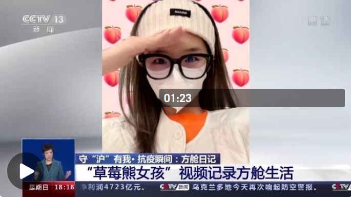 我們首先來認(rèn)識一個“草莓熊女孩”。4月14日,在世博方艙待了15天的凱梨終于回家了。從接到疾控中心的第一個流調(diào)電話開始,凱梨就開始用視頻記錄她這一段特殊的人生經(jīng)歷。因為隨身帶的小玩偶很搶眼,大家也親切地稱呼她“草莓熊女孩”。活潑樂觀的凱梨用細(xì)膩、善意、理解的目光記錄著方艙內(nèi)的一切,在她的方艙日記里,還有這樣一段溫暖的紀(jì)錄:在世博展覽中心方艙醫(yī)院,每天中午及傍晚,都有一個聲音準(zhǔn)時響起,就是這個專門為方艙中正在接受隔離治療的感染者們開通的專屬電臺。他們有一套獨(dú)立的廣播系統(tǒng),平日發(fā)布一些通知、信息,也會播放音樂、相聲等舒緩情緒的節(jié)目。“草莓熊女孩”凱梨說,每次一放音樂就忍不住跟著哼唱起來。