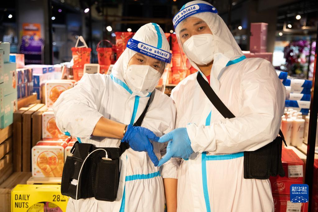 曹冉和徐清秋夫婦是盒馬成都一家門店的員工,兩人都是“Z世代”(一般指出生于1995年至2009年)的年輕人。曹冉負(fù)責(zé)理貨盤點(diǎn),徐清秋負(fù)責(zé)揀貨。4月13日原本是兩人約定拍婚紗照的日子,小兩口一商量,臨時(shí)決定取消了婚紗照的拍攝,一起隨團(tuán)隊(duì)前往上海,幫助上海門店加速恢復(fù)運(yùn)轉(zhuǎn)。他們說:“夫妻一起上陣,反而沒牽掛、負(fù)擔(dān),可以做更有意義的事。”他們期待上海疫情早日結(jié)束,可以在上海度蜜月。新華社記者 金立旺 攝