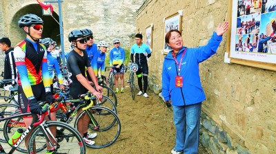 長城衛士”袁建琴在為騎行車手講解長城攝影展照片背后的長城故事。資料圖片