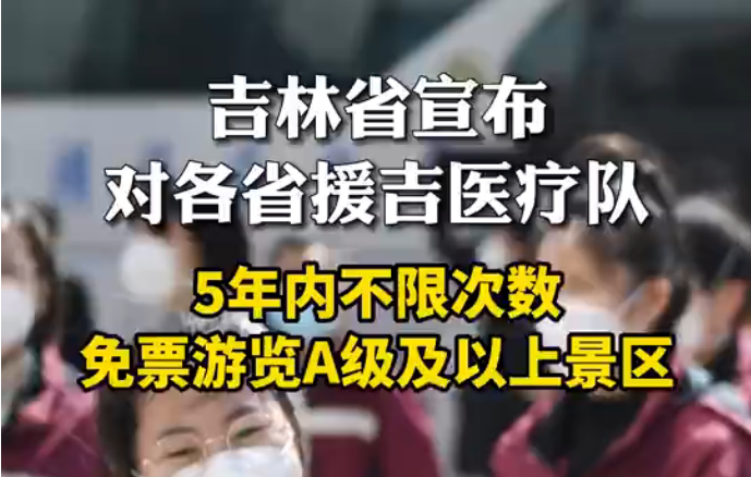 【馳援吉林醫療隊可免票到吉旅游】吉林省宣布:各省份援吉醫療隊隊員,可攜4位家屬,5年內不限次數免門票游覽吉林省A級及以上旅游景區!