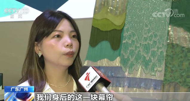 參展企業(yè)研發(fā)中心設(shè)計(jì)師 黃雨桐:我們身后這一塊幕簾,是通過(guò)我們?nèi)粘Ia(chǎn)的邊角料,一針一線來(lái)組成的,黃色代表大地,綠色代表植被,藍(lán)色代表大海。