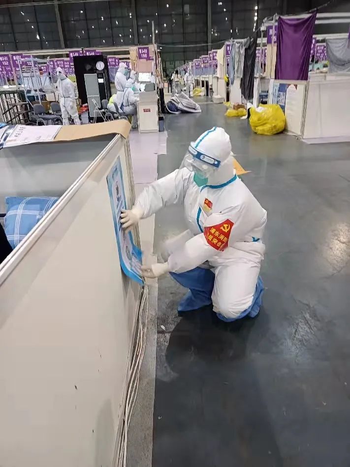 我主動申請進入人數最多、情況最復雜的H1艙,進艙后便第一時間投入工作。檢查消防設施、緊急疏散通道、檢查用電安全情況……艙內一圈下來,汗水早已濕透了衣服。可是想到自己的工作,我又覺得付出很值得。進艙的前三天,我組織張貼消防海報500余張,收繳大功率電器6個,組織清理違規搭建的床單30余處,為方艙的安全消除隱患,這是我的職責。進駐初期人員緊張,兩天內我和同組的隊員進艙18個小時,黑眼圈成了“標配”。包裹了兩層防護服,身體體感異常悶熱,為了不耽誤工作,我們進艙前2小時就停止喝水,艙內悶熱,汗水浸透衣服,嘴唇干裂難受,但我們都覺得再辛苦也值得,為了“小家”更為了“大家”。