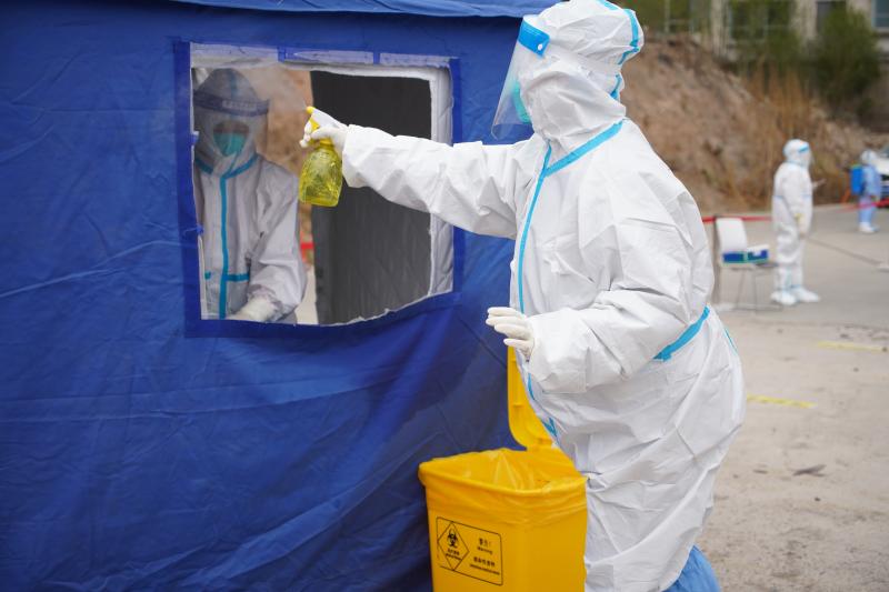 4月15日,在青海省西寧市城西區一處核酸采集點,防疫人員正在做消殺。(新華社記者 張子琪 攝)