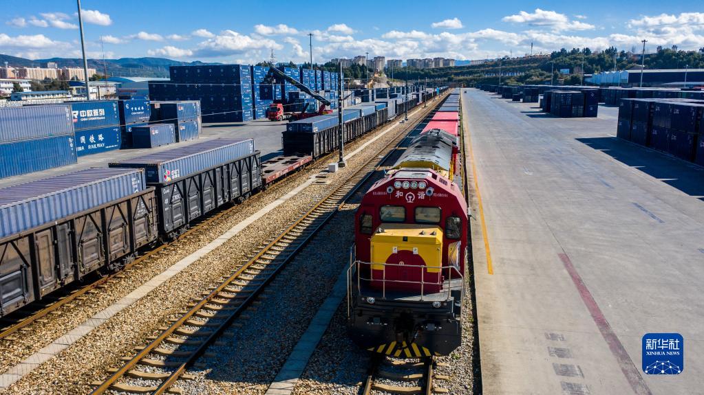 2022年1月1日,滿載30個標(biāo)準(zhǔn)集裝箱的中老鐵路新年首趟國際貨物列車停靠在中鐵聯(lián)集昆明中心站(無人機(jī)照片)。新華社記者 胡超 攝
