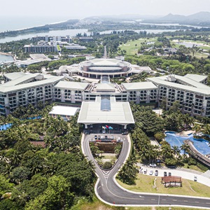 博鰲亞洲論壇國際會議中心會場外,萬泉河、九曲江、龍滾河三水交匯,流入一望無際的南海。