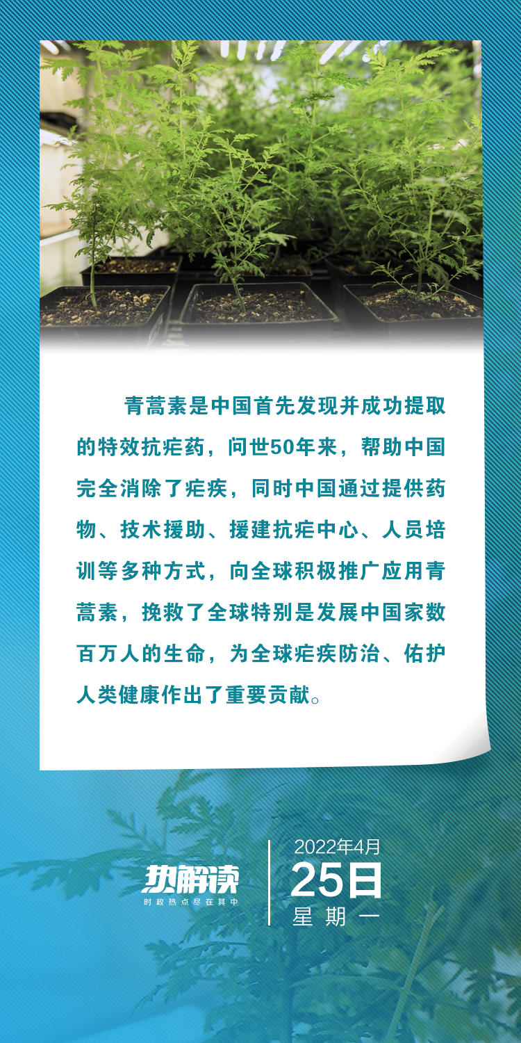 熱解讀4月25日是“世界防治瘧疾日”。習近平主席向青蒿素問世50周年暨助力共建人類衛生健康共同體國際論壇致賀信。
