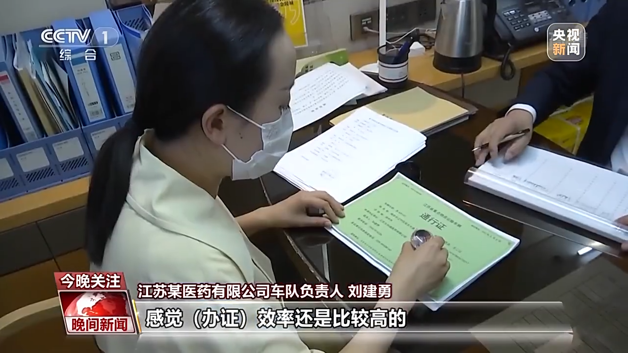 江蘇某醫藥有限公司車隊負責人 劉建勇:因為我們這塊兒主要做的是藥品和防疫物資的配送,所以我們到每個城市的話,都是醫療機構給我們報的計劃,所以我們必須要第一時間運送到那邊去。感覺(辦證)效率還是比較高的,我們從準備到現在的話就兩天時間。