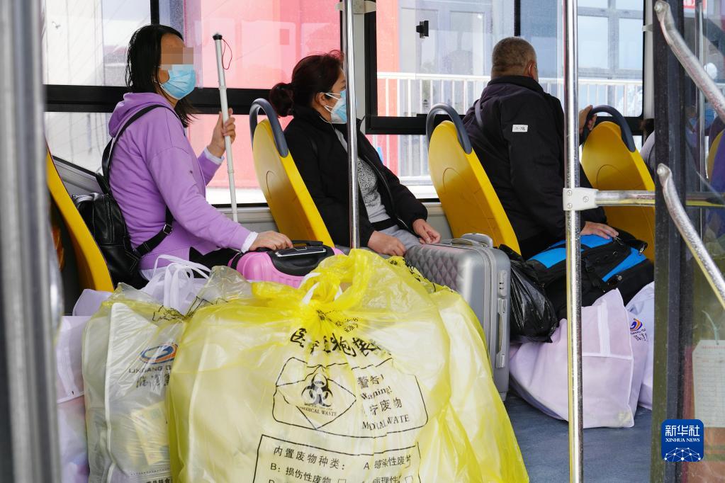 4月30日,康復出艙人員離開上海臨港方艙醫院,乘坐轉運車輛返回居住地接受健康監測。