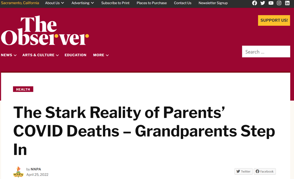 中國日報網5月1日電 據美國《薩克拉門托觀察家報》(The Sacramento Observer)網站報道,近日新發布的報告顯示,美國有20萬兒童因新冠疫情失去父母。當年幼的孤兒面臨如此不幸的悲劇時,許多年邁的祖父母不得不承擔起主要看護者的角色。而這些“新冠孤兒”中,有色人種兒童的占比更高。