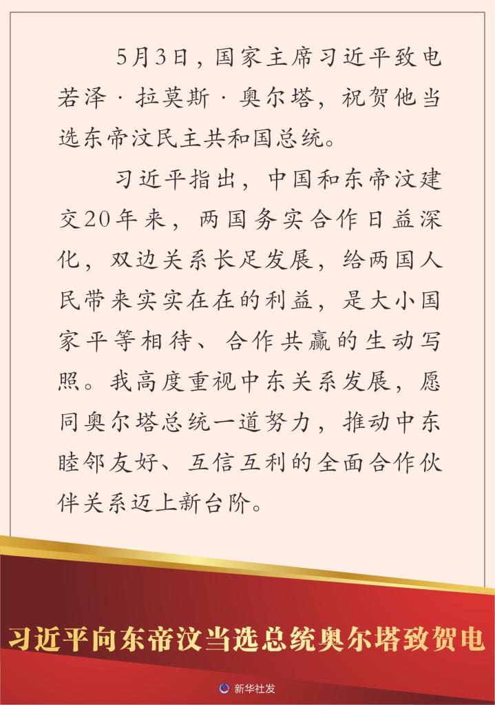 新華社北京5月3日電 5月3日,國家主席習近平致電若澤·拉莫斯·奧爾塔,祝賀他當選東帝汶民主共和國總統。