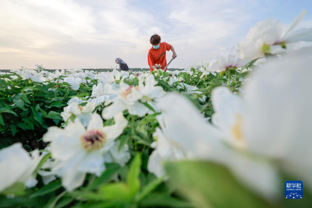 5月5日,農民在河北省唐山市豐南區唐坊鎮趙翎莊村的油用牡丹田勞作。