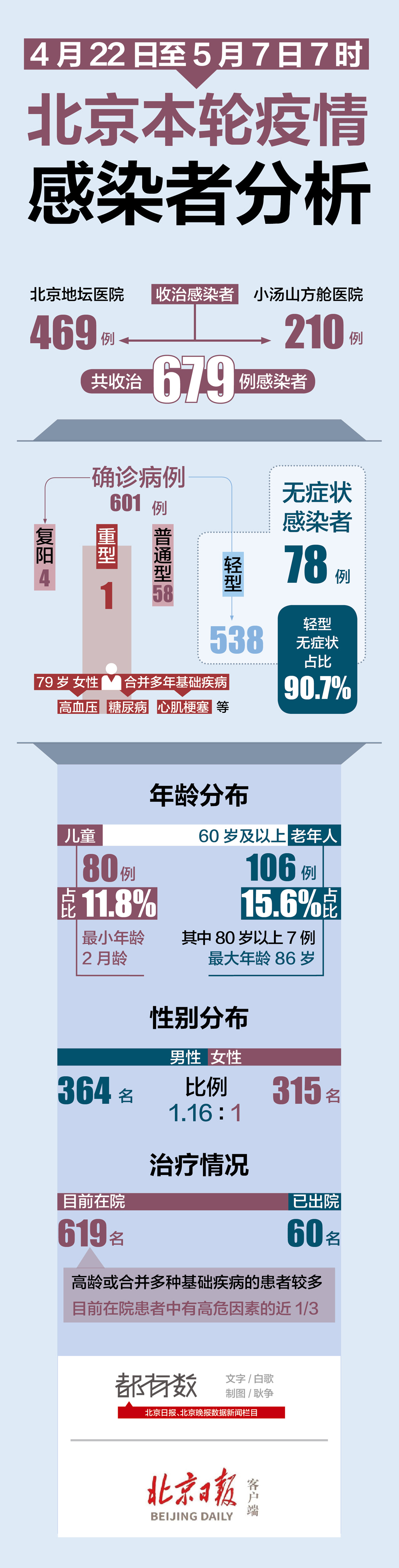 5月7日下午,北京市新冠肺炎疫情防控工作第327場新聞發布會披露了本輪疫情截至5月7日7時的感染者收治情況。重癥有多少例?無癥狀和輕癥占比多少?年齡分布有何特征?一圖讀懂——